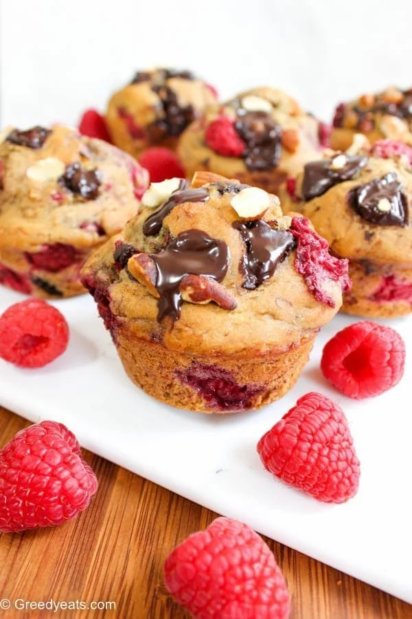 • Main Ingredients: Whole Wheat Pastry Flour, Greek yogurt, Raspberries, Dark Chocolate Chips, Honey