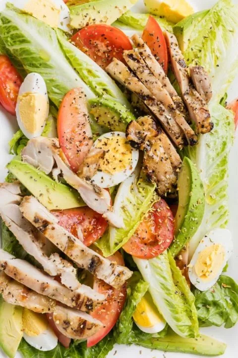 This refreshing salad combines creamy avocado with tender chicken and hard-boiled eggs, delivering a satisfying blend of healthy fats and protein.