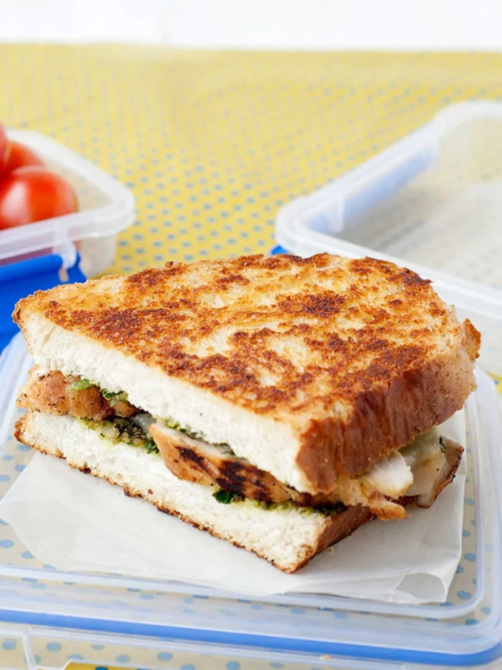 This Grilled Chicken Pesto Sandwich is a gourmet option for your lunchbox: buttery and toasty bread filled with chicken is always a winner.